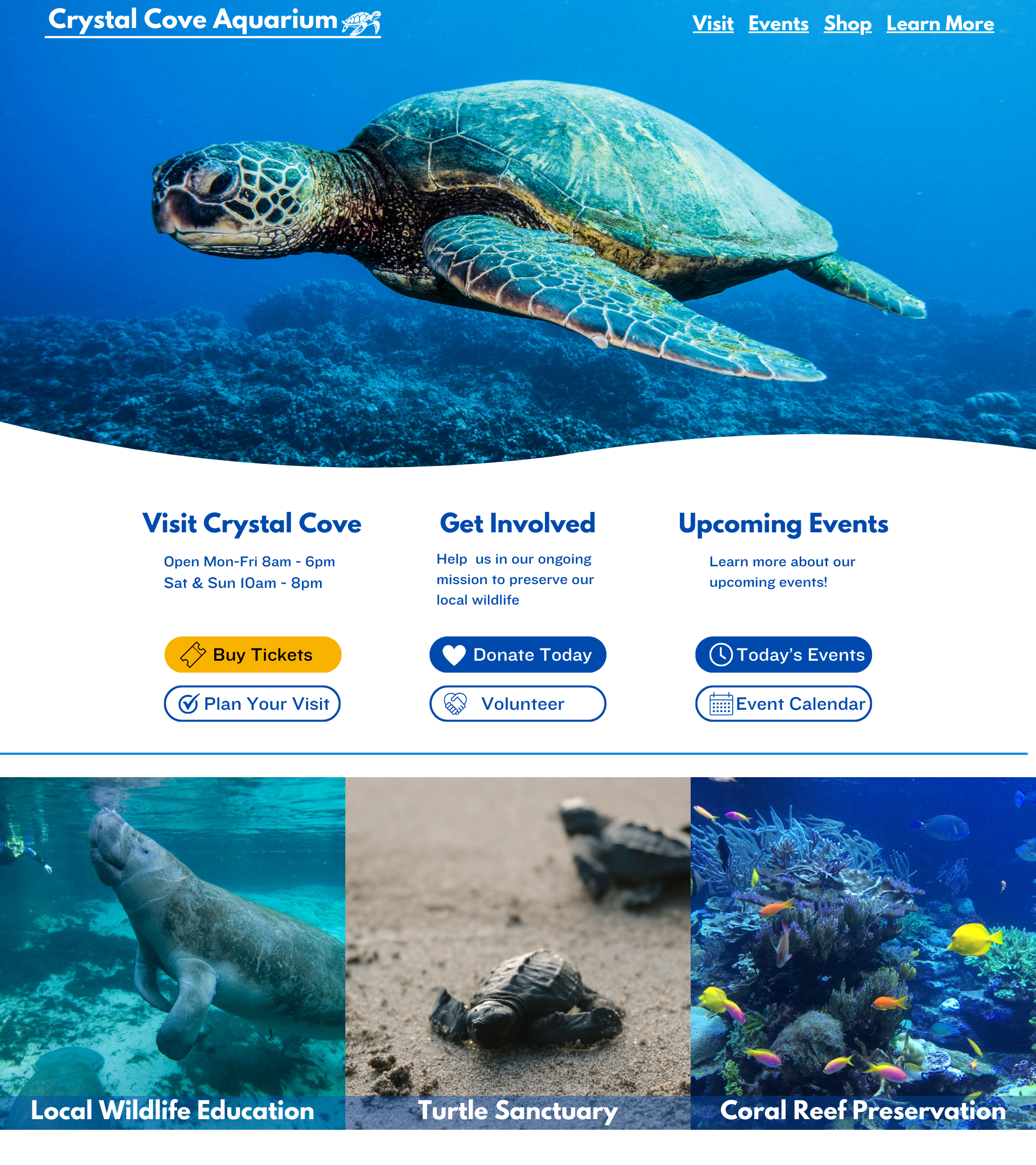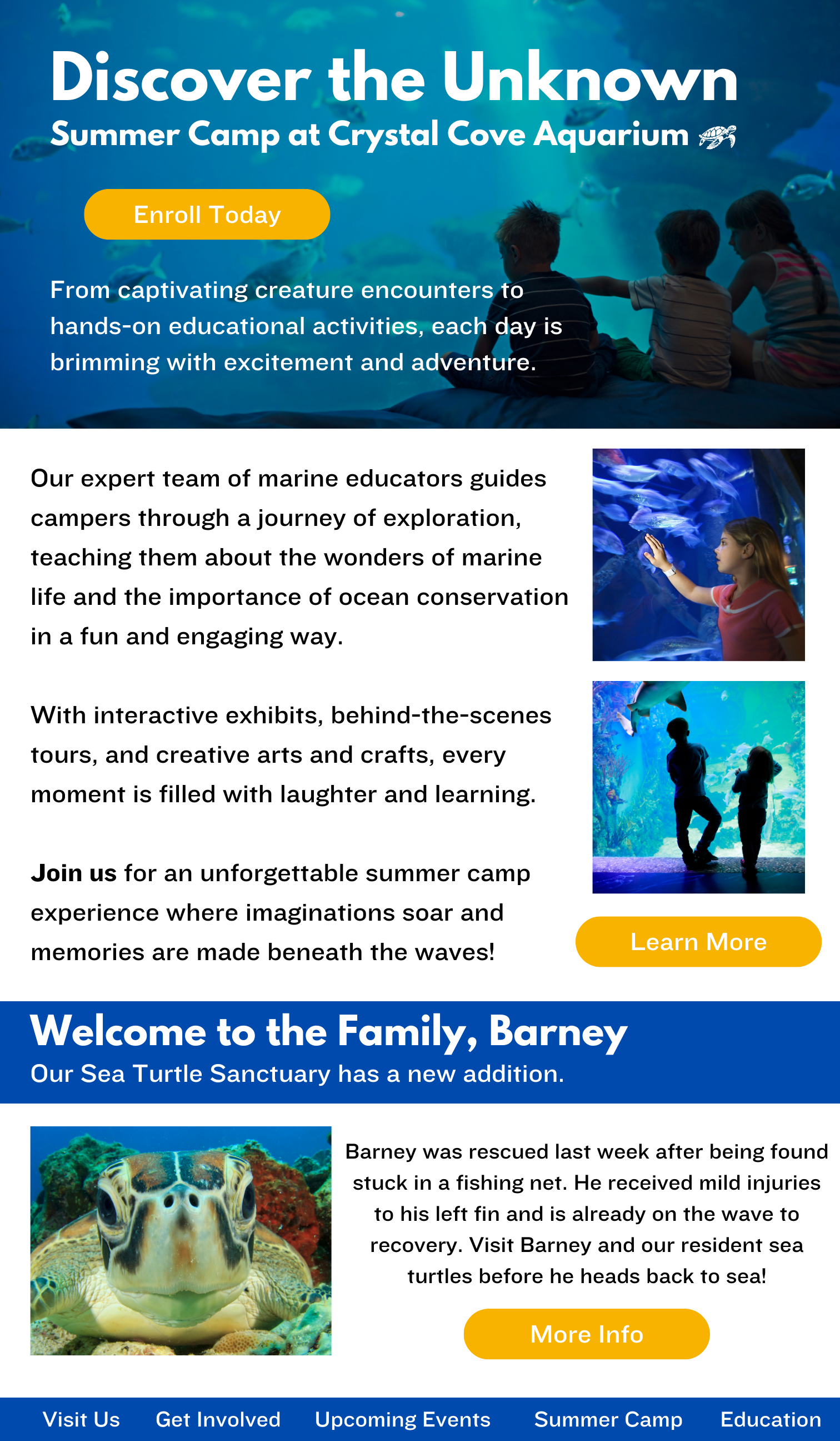 Our email design or Crystal Cove Aquarium highlights a summer camp opportunity for children with beautiful imagery and informative copy.